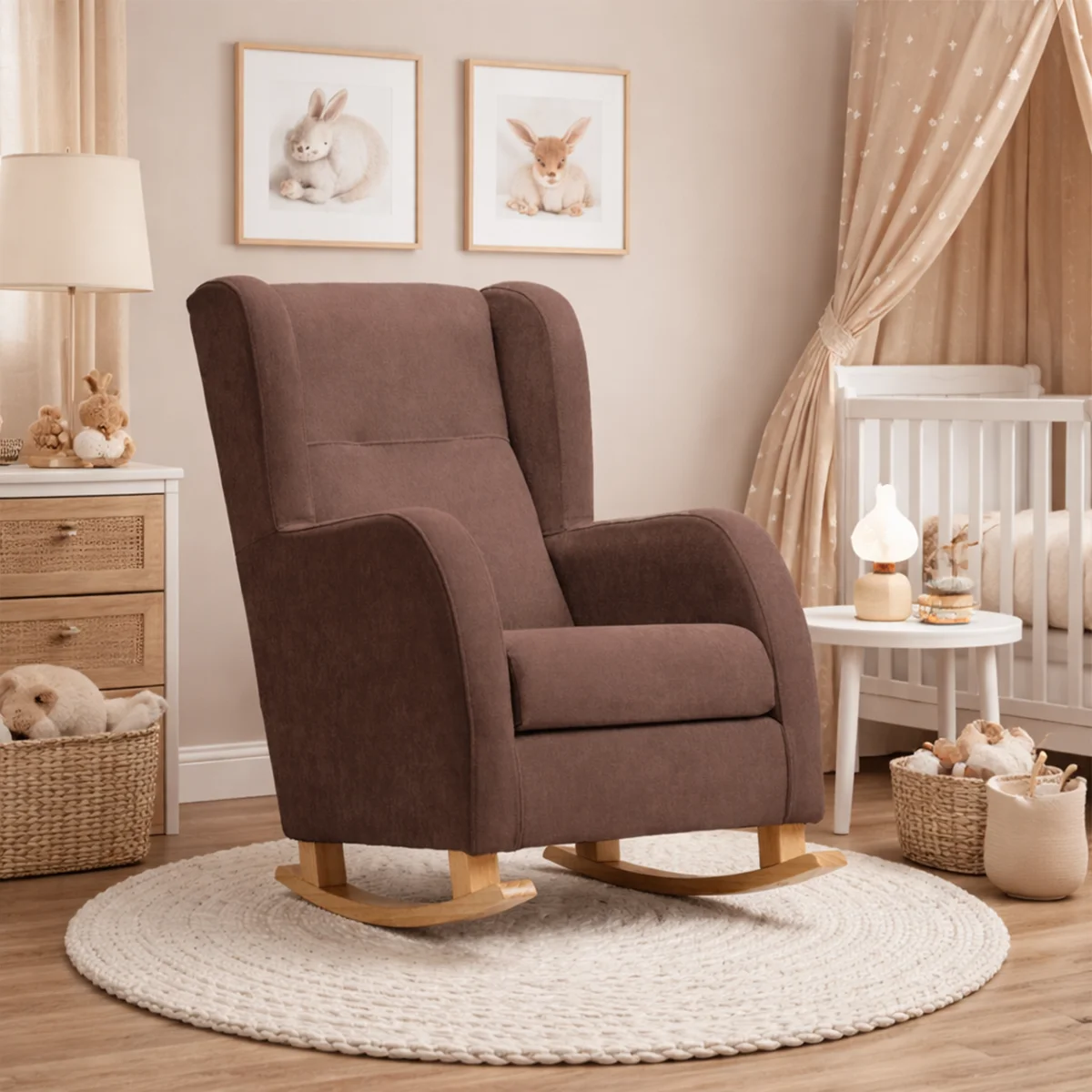 Esta mecedora de lactancia en marrón ha sido diseñada para ofrecer confort y durabilidad a largo plazo. Sus patas permiten un suave balanceo, ideal para amamantar o relajar al bebé. Además, incluye patas fijas que puedes instalar cuando el niño crezca, lo que convierte la mecedora para dar el pecho en una elegante butaca de lectura o en una pieza decorativa perfecta para el dormitorio.