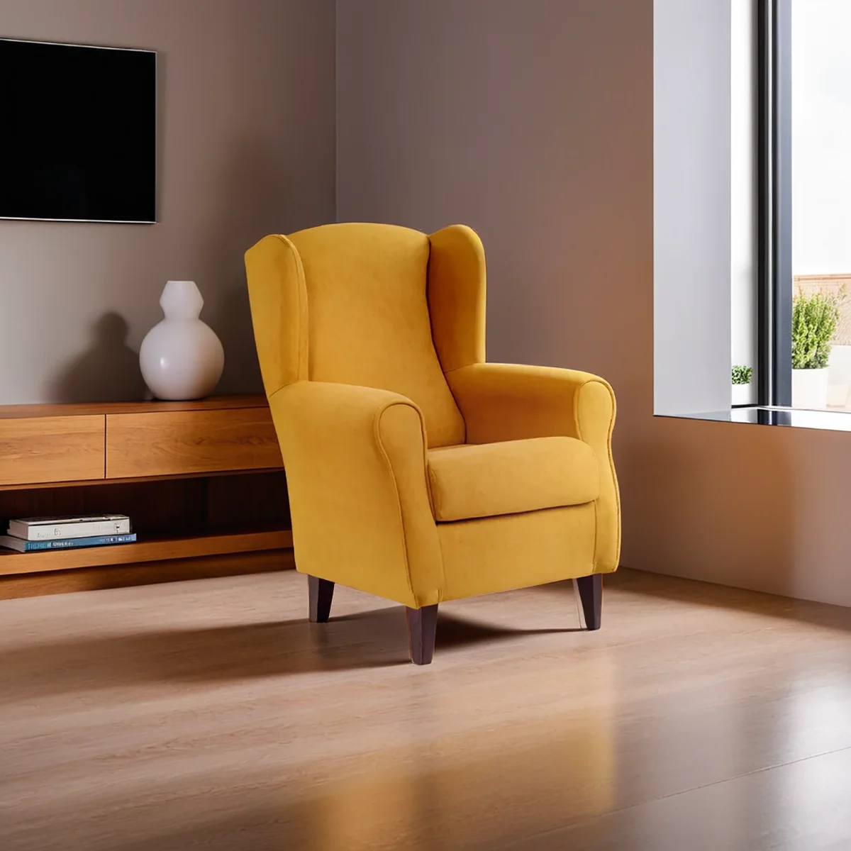 Nuestro sillón orejero mostaza es un auténtico flechazo. Su diseño atemporal y su vibrante tono mostaza aportan luminosidad y carácter a cualquier espacio, ya sea un salón acogedor o un rincón de lectura con encanto.